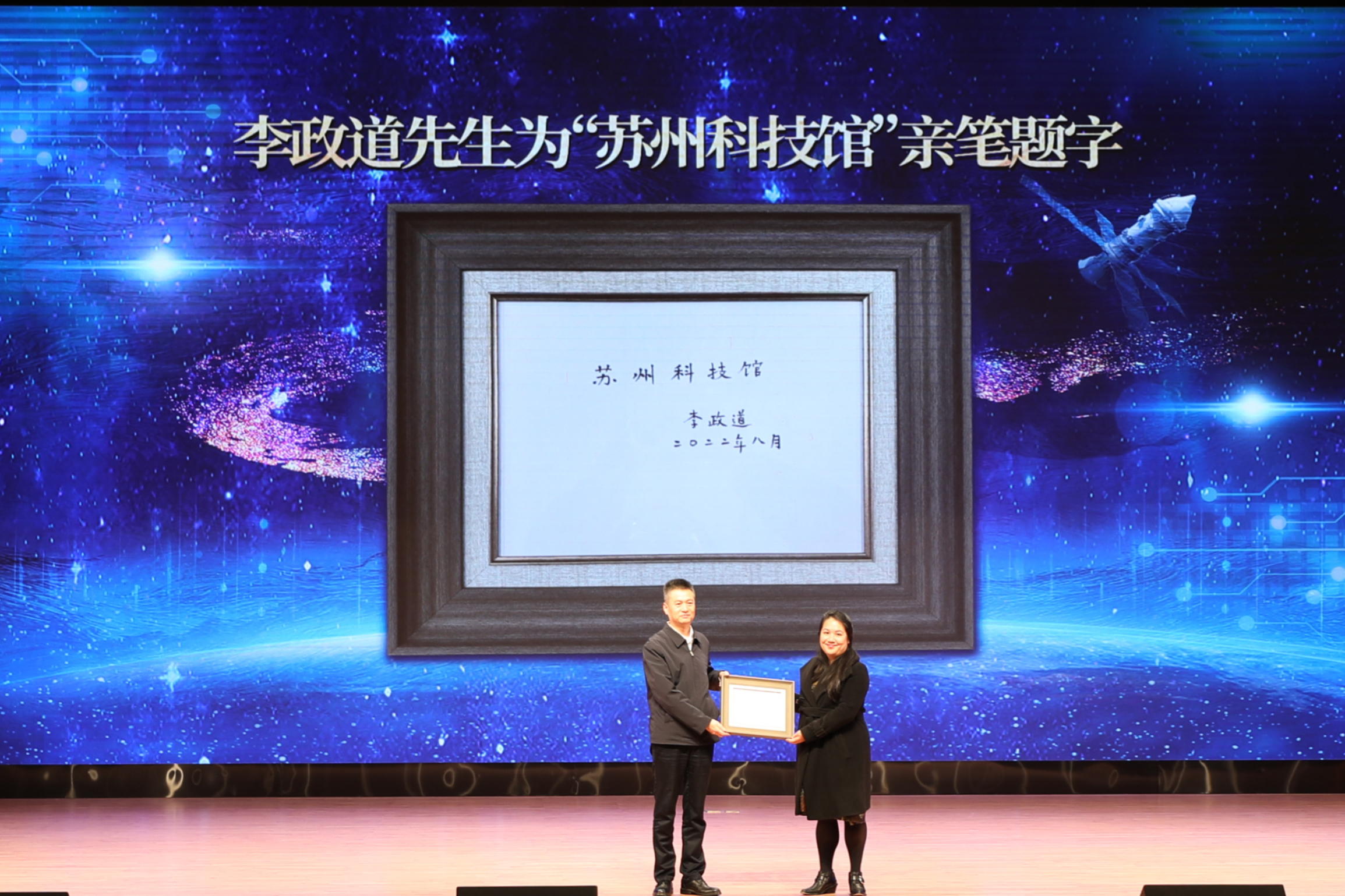 李政道先生孙女李善玄代表亲属向苏州市赠送李政道先生为“苏州科技馆”的亲笔题字。苏州市向李政道先生亲属代表赠送李政道先生书写体“细推物理、何用浮名”宋锦作品。